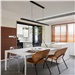 餐厅集合了餐桌、中岛台和西厨,按照冰箱的尺寸定制了餐边柜,增加收纳空间同时又可以嵌入摆放冰箱。餐厅地面与客厅保持一致,灰色地砖错缝通铺。相邻的厨房,采用三轨联动吊轨移门,无下轨设计,整洁美观,方便以后卫生清洁。