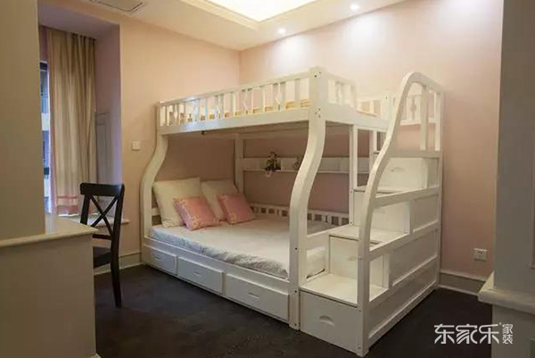 儿童房简单漂亮,特别满意这高低床,不仅外观很入眼,还自带抽屉储物,刚好可以收纳孩子的玩偶、玩具。