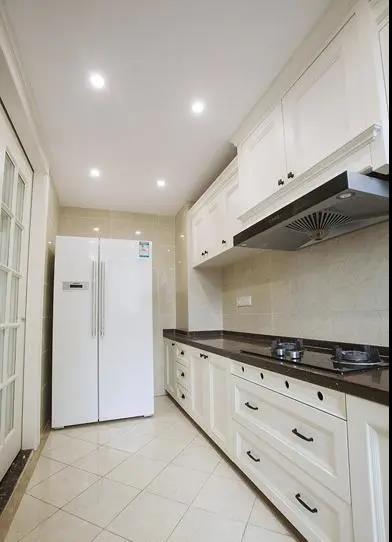 厨房简洁亮堂,颜色以白色为主,也许时间长了会泛黄,就当岁月的痕迹吧。地砖菱形铺贴,天花板做平吊顶,筒灯替代吊灯,效果不错。