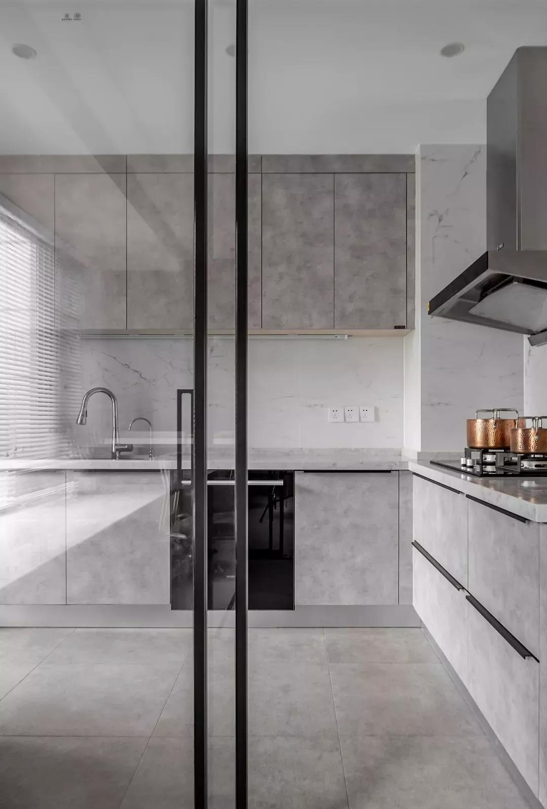 厨房,灰色岩板搭配大理石瓷砖倍感舒适放松,极窄边框玻璃门让空间更开阔通透。