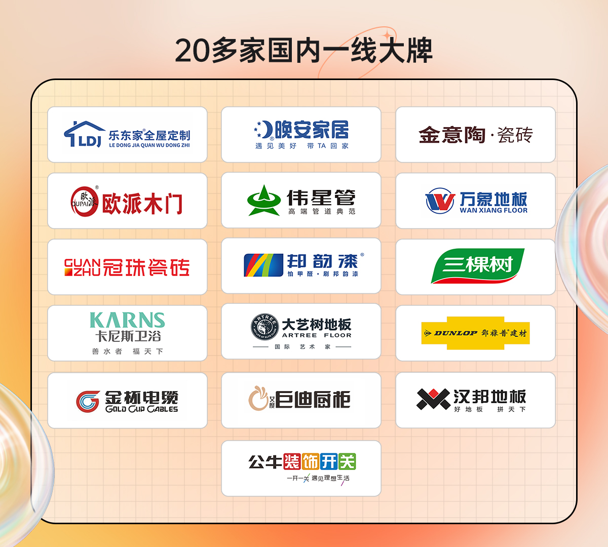 为做好此次千万补贴迎双节活动的感恩好礼,东家乐家装主材工艺免费升级,对产品质量、环保等级提出了更高要求,因此材料均是选用的国内一线品牌主材辅材,给大家带来不一样的装修好礼。
