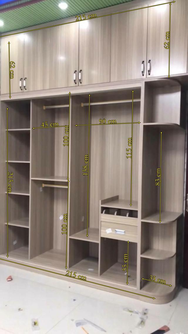 衣柜进深60公分,一定要做到顶,上面设计一排顶柜放置棉被,中间1米上挂外套,下面90公分挂毛衣。
